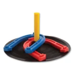 Safer and softer than traditional horseshoes, the Champion Sports Rubber Horseshoe Set can be used indoors or outdoors for total versatility. The colorful horseshoes are easy to spot for both players and spectators. They come in two different colors for competitive play. Ready to play right out of the box, this rubber horseshoe set comes complete with horseshoes, protective playing mats, bright pegs, and dowels.