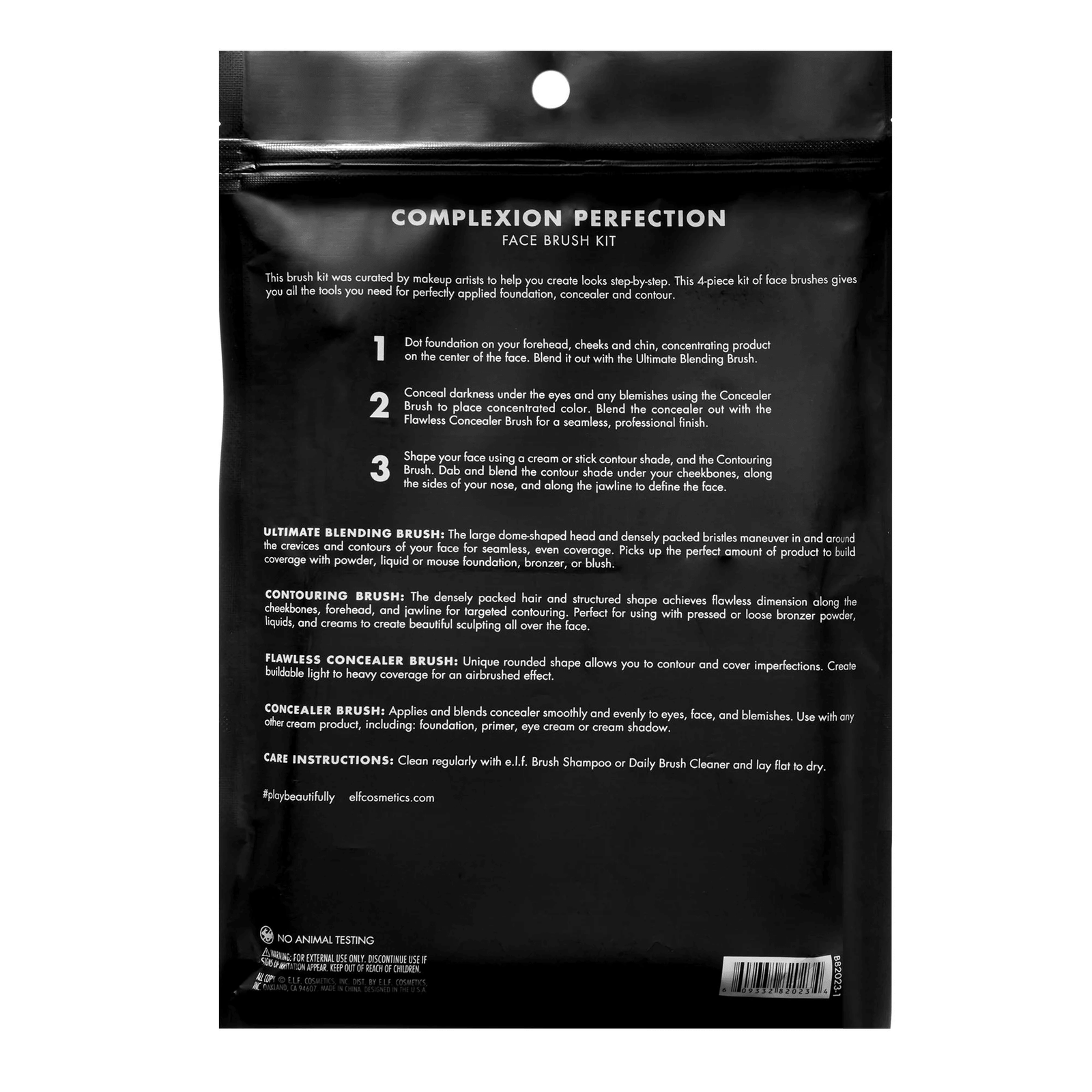The e.l.f. Complexion Perfection Brush Kit was curated by makeup artists to help you create looks step-by-step. This 4-piece face brush kit gives you all the tools you need for perfectly applied foundation and concealer. This cruelty-free brush kit is made with 100% animal hair-free, synthetic bristles that are soft and easy to clean.