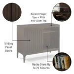 - Dimensions and Storage Capacity: Measuring 18 inches deep 42.13 inches wide and 34.63 inches high this media console offers ample storage space for records and media essentials. It includes slatted sliding doors that provide easy access to contents while adding a decorative element to the console’s design.