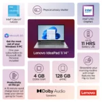 The IdeaPad™ 1i raises the bar on every affordable laptop with a super-efficient Celeron Intel® processor in a thin and compact 17.9 mm chassis that makes multitasking a breeze while boosting energy efficiency with up-to-11 hours of battery life and rapid charge. Get more value with four-sided narrow bezels for maximum screen, Dolby Audio™ speakers and Flip to Start for instant bootup. Optimize your video call experience with a 720P camera that comes with a privacy shutter to keep out prying eyes and Smart Noise Cancelling to cut out back ground noise.