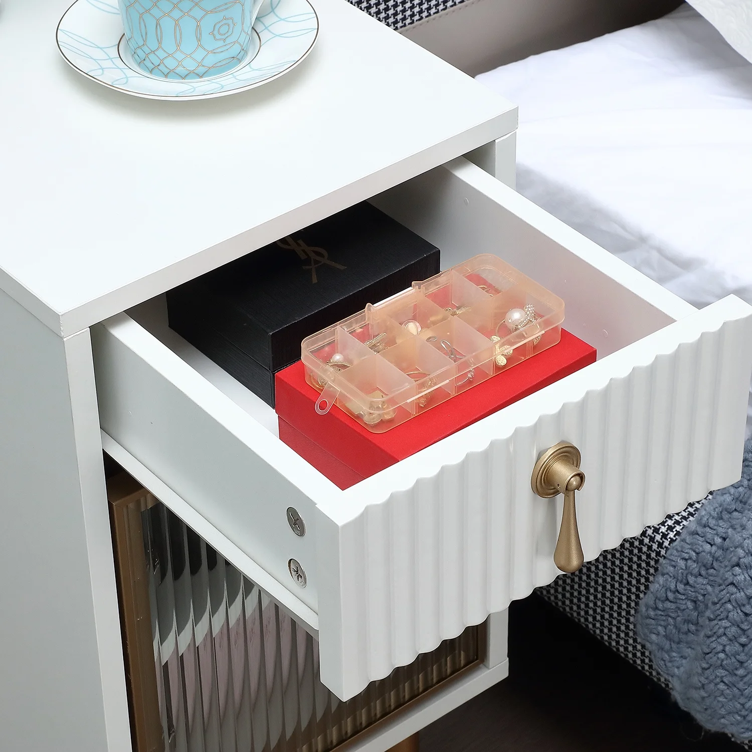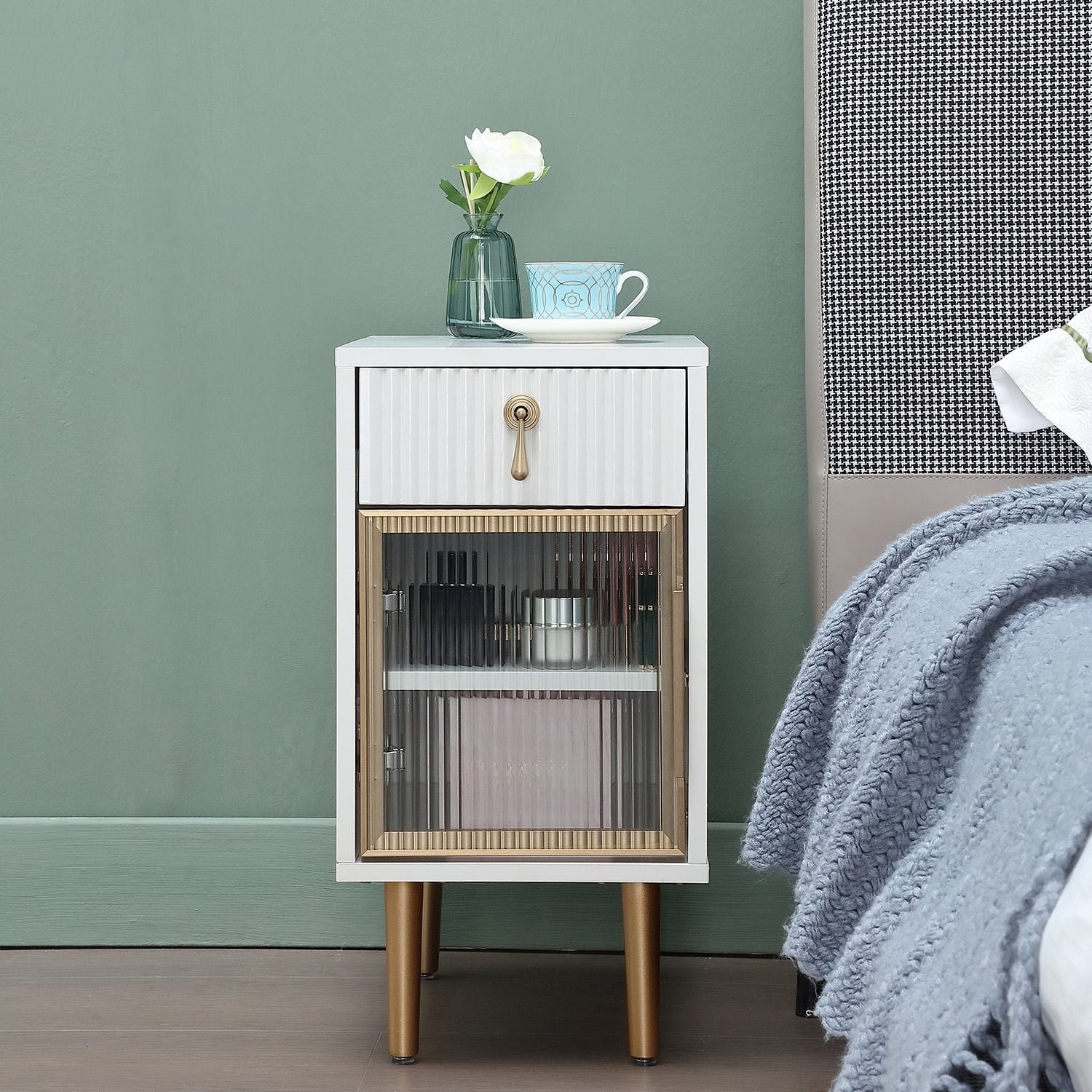 - 【Nightstand with Drawer】:This white and gold nightstand has 1 drawer and large space storage cabinet to hold essentials like magazines,daily necessities and more, tabletop is compact for lamps, books, or watercup,etc. Keep the bedtime items you need within easy reach with this modern bed side table.