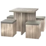 - Combine dining and storage with this striking dining set that hides storage in each of the ottomans that serve as dining seating.