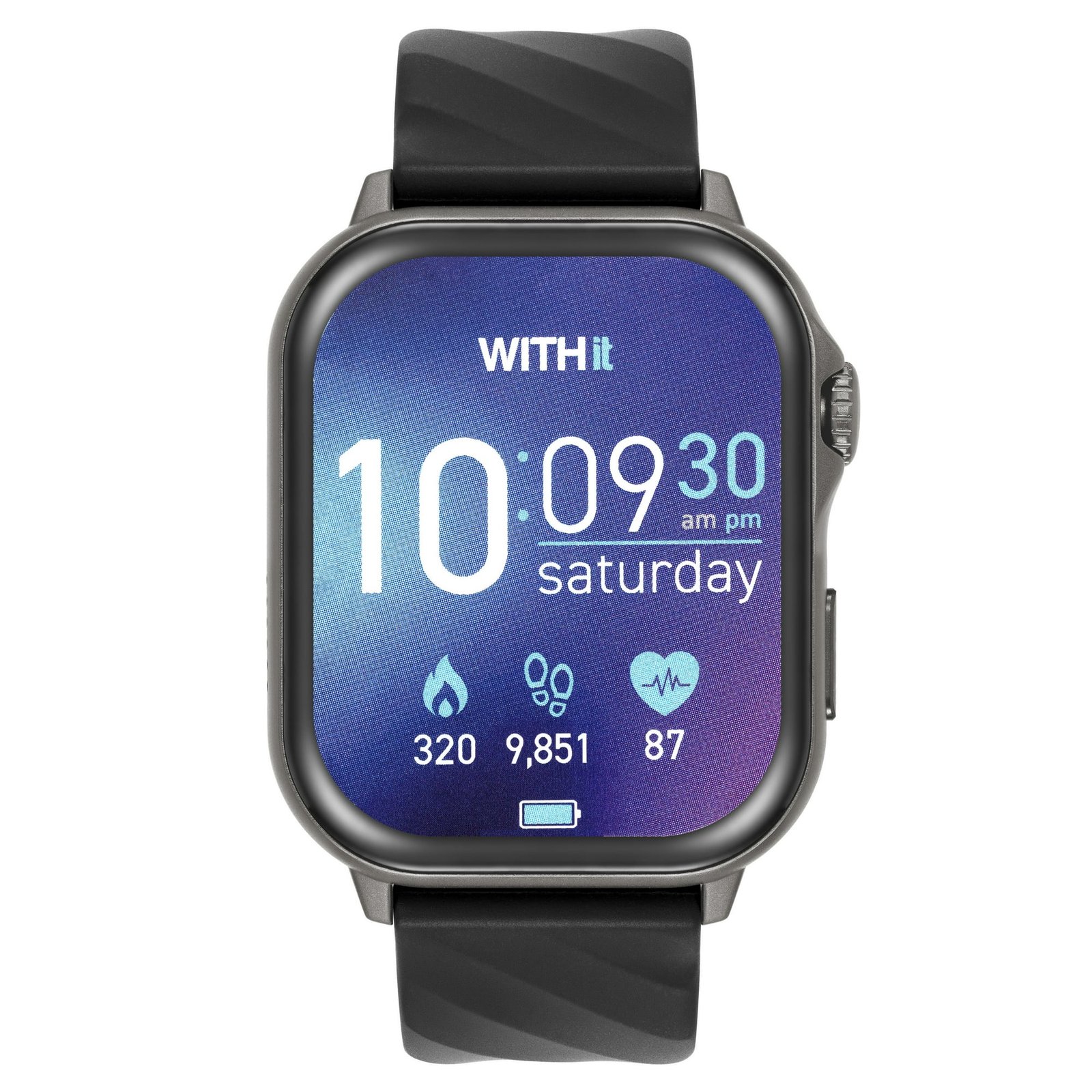 The WITHit Giga Unisex Smartwatch seamlessly integrates into your lifestyle. It features an AMOLED high-definition touchscreen display and a silicone band with quick-release technology; you can stay connected by making and receiving calls directly from your wrist. Customize your experience with a personalized dial from your smartphone gallery. The Giga smartwatch has various health modes like calorie tracking, step counting, heart rate monitoring, and other sports modes. Additional features include music control, women’s reproductive health tracking, voice assistant, and more, all connected through the smartwatch and WITHit App.